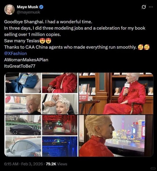 昨日,马斯克的母亲梅耶·马斯克在社交平台发文,分享自己结束上海旅程的心情。
