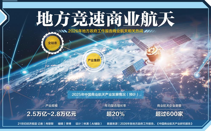对于地方两会的相关部署,国研新经济研究院创始院长、湾区低空经济研究院院长朱克力对21世纪经济报道记者表示,从产业规律看,航空航天产业上下游环环相扣、技术协同性强,运载火箭、卫星制造、地面设备、应用服务等环节缺一不可,任何一环短板都会制约整体效能,全链条布局能消除“断点”“堵点”,形成“研发—制造—发射—应用”的闭环,提升产业整体竞争力。从国家战略层面,当前全球太空竞争日趋激烈,核心技术自主可控成为关键,全产业链部署可推动关键核心技术攻关,降低对外部供应链的依赖,保障国家太空安全与产业安全。从地方发展诉求而言,航空航天产业带动力强,全链条布局能催生集群效应,吸引上下游企业集聚,创造大量高端就业岗位,推动区域经济转型。