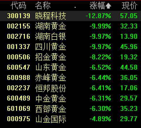 黄金概念股持续跳水,白银有色、湖南黄金、湖南白银、四川黄金触及跌停,晓程科技跌超10%。