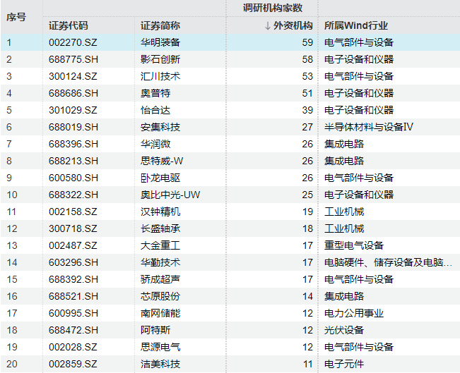 Wind数据显示,今年以来,华明装备累计获得59家外资机构调研,在所有公司中位列第一;影石创新和汇川技术分别以58家和53家的调研家数位居第二、第三。此外,奥普特、怡合达、安集科技、华润微、思特威等公司也吸引了超过20家外资机构前来调研。
