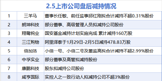 据统计,2月5日,盘后暂无A股上市公司披露增持情况。包括三羊马、朗坤科技、翔鹭钨业、三江购物、倍加洁、中孚实业、康鹏科技、咸亨国际在内的8家A股上市公司披露减持情况。