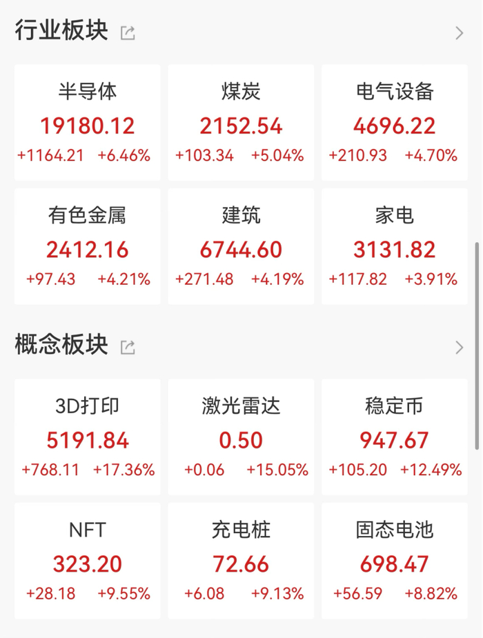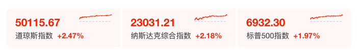 昨夜今晨,美股三大股指大幅收涨。截至收盘,道琼斯工业平均指数涨2.47%,报50115.67点;标普500指数涨1.97%,报6932.3点;纳斯达克综合指数涨2.18%,报23031.21点。