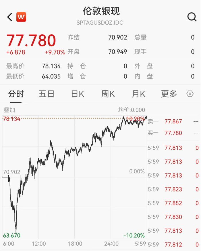 现货白银一度突破78美元/盎司,日内涨9.7%。