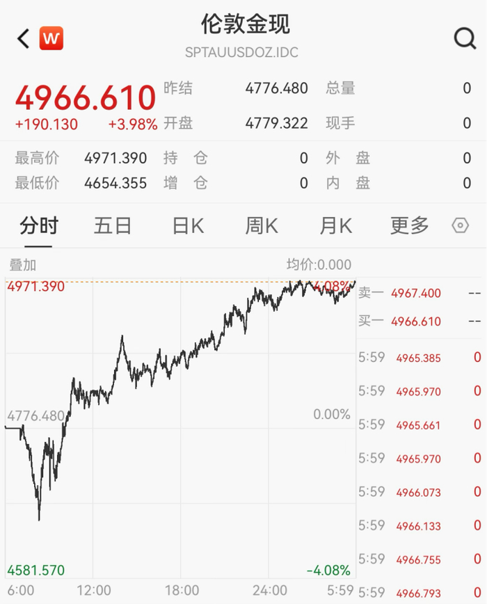 昨夜今晨,现货黄金日内暴涨近4%,最高报4971.39美元/盎司,现报4966.61美元/盎司。