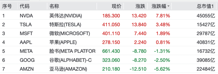 另外,特斯拉涨3.48%,微软、苹果亦上涨;亚马逊跌5.62%,谷歌跌2.5%,META1.31%
