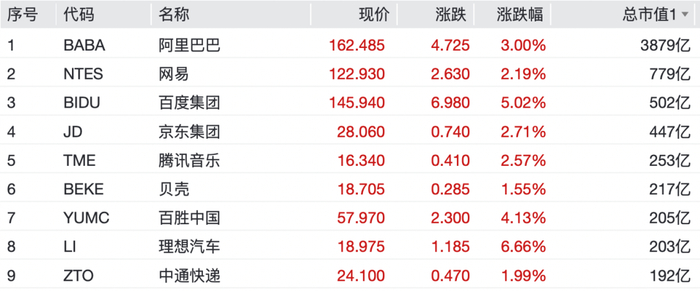 中概股多数上涨,纳斯达克中国金龙指数涨3.71%。热门中概股方面,阿里巴巴涨超3%,百度集团涨逾5%,理想汽车涨超6%,网易、京东集团、腾讯音乐等纷纷上涨。