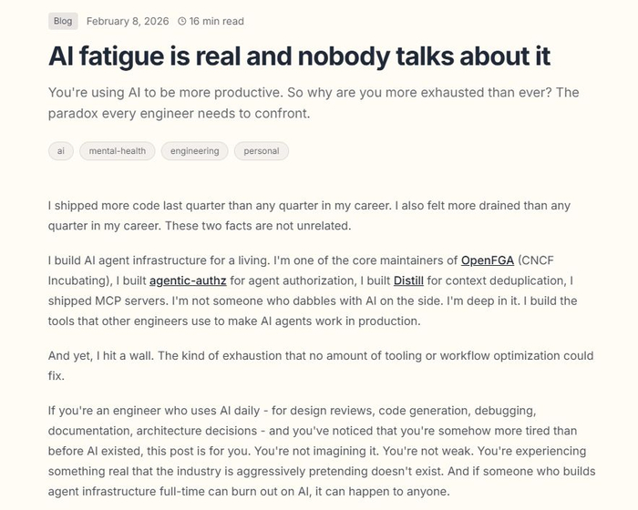 然而,科技公司Ona的软件工程师Siddhant Khare发布的《AI疲劳真实存在,却无人谈及》一文,引发了全球媒体和读者的广泛讨论。