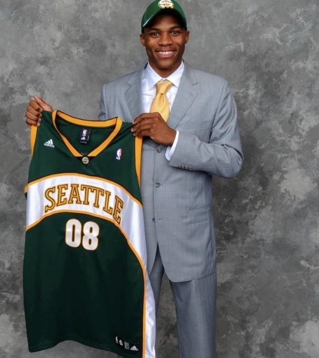 值得一提的是,威少在2008年首轮第4顺位被超音速选中,当时他手举的就是超音速的球衣。