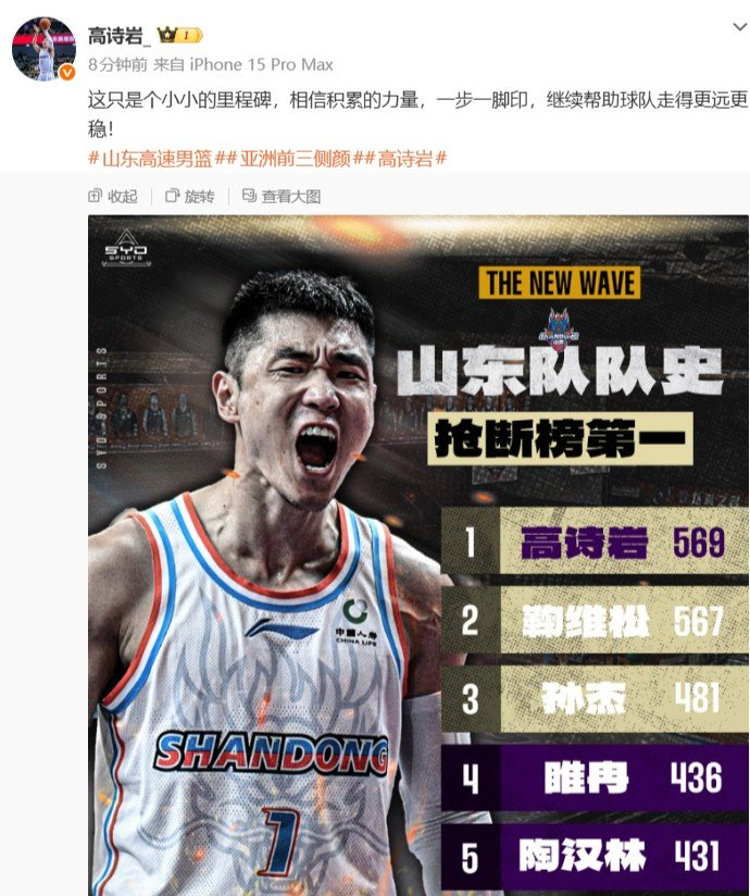 值得一提的是,此役过后,高诗岩以569次抢断超越山东男篮名宿鞠维松,升至山东队史抢断榜第一位。随后,高诗岩发文写道:“这只是个小小的里程碑,相信积累的力量,一步一脚印,继续帮助球队走得更远更稳!”