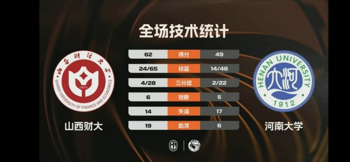 末节争夺,山西财大命中率下降,河南大学努力追赶,史航飙中打板三分,王瑞剑内线得手打破得分荒,宋承烨再造杀伤罚中1分,但时间所剩无几。山西财大稳扎稳打保持场上优势,河南大学苦苦追赶无果。最终,山西财大62-49击败河南大学,获得胜利。
