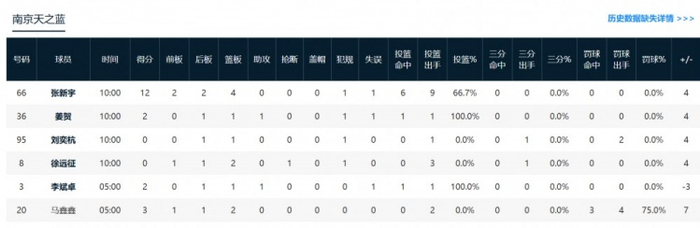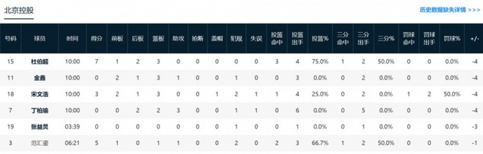 北控:杜伯超7分3篮板,范汇鎏5分1篮板1助攻。