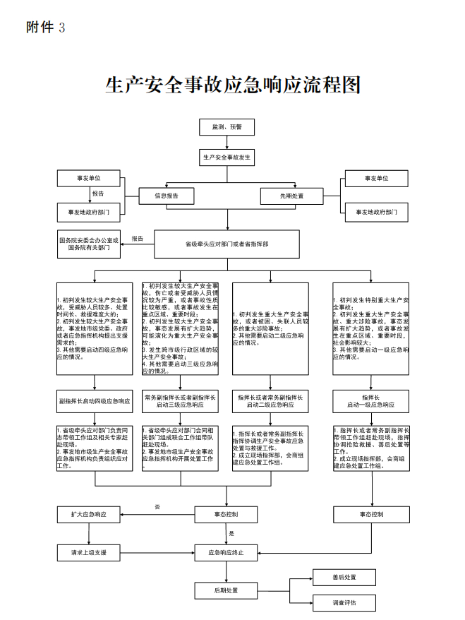 在分级应对方面,初判发生特别重大、重大生产安全事故时,原则上由省委、省政府组织指挥应对;初判发生较大、一般生产安全事故时,原则上由事发地市、县级党委、政府组织指挥应对。跨行政区域的事故则由相关行政区域联合应对,或由共同的上一级党委、政府组织指挥。