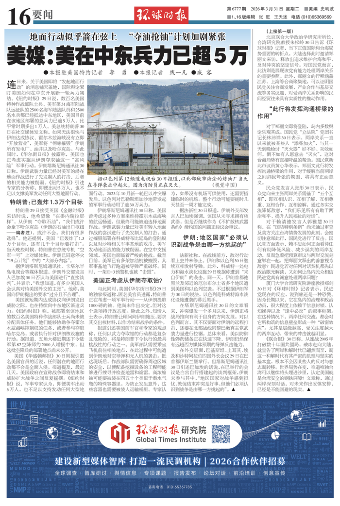 连日来,关于美国即将“发起地面行动”的消息铺天盖地,国际舆论紧盯美国如何在中东开展新一轮兵力集结。《纽约时报》29日说,数百名美国特种作战部队士兵、美军第31海军陆战队远征队的2500名海军陆战队员和2500名水兵都已经抵达中东地区,美国目前在该地区部署的总兵力已逾5万人,比平常时期多出1万人。美总统特朗普30日在社交媒体发文称,如果无法很快与伊朗达成协议、霍尔木兹海峡没有立即“开放营业”,美军将“彻底摧毁”伊朗所有发电厂、油井以及哈尔克岛。与此同时,《华尔街日报》披露称,美国也正考虑实施从伊朗夺取铀这一“高风险”军事行动。伊朗塔斯尼姆通讯社30日称,伊朗武装力量已经对美军的潜在地面作战进行了先发制人的打击,后者的相关能力被削弱。《纽约时报》引述专家的分析称,即便出动5万人,也不足以支撑美军发动任何大型地面行动。