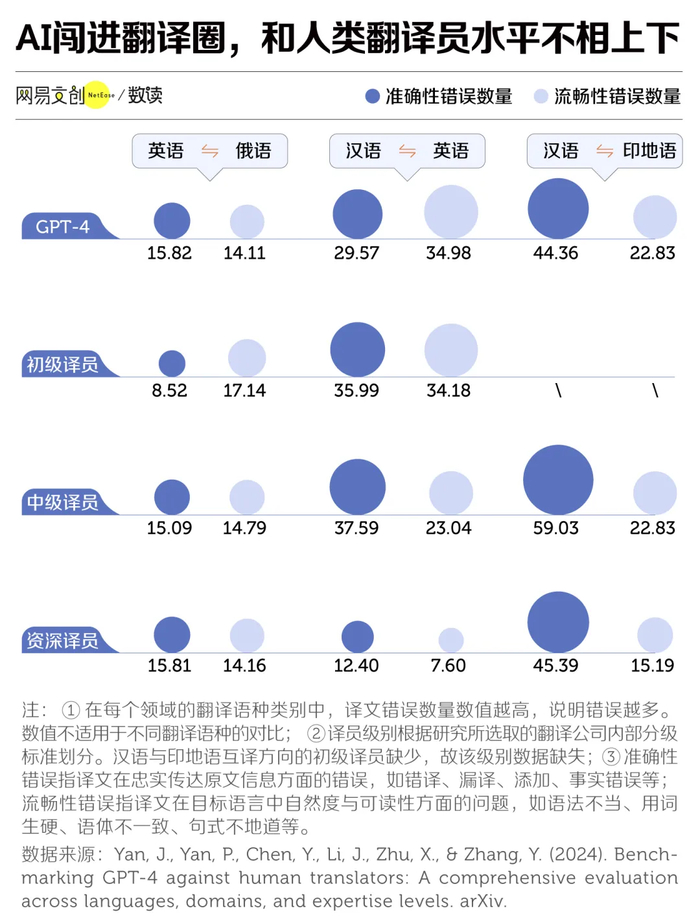 结果发现,GPT-4 的错误率竟然低于大多数初中级译员。 在英语、俄语互译和汉语、印地语互译的准确性上,它甚至能与资深译员平起平坐。