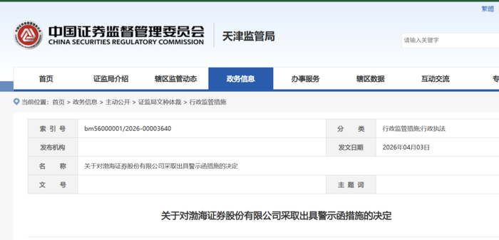 【导读】渤海证券收警示函